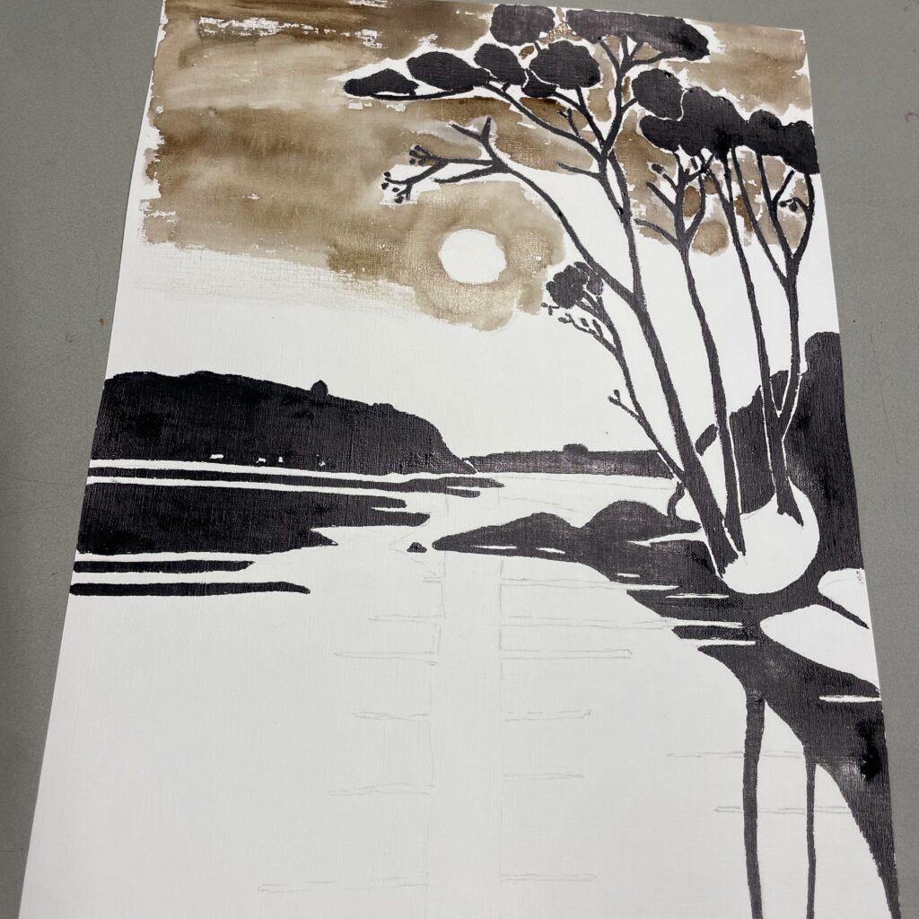 Een krachtige oefening die ik mijn leerlingen laat doen, bijvoorbeeld tijdens een plein air workshop in Zeeland, is het maken van een Japanse Notan schildering. Notan draait om het vereenvoudigen van een beeld naar grote vlakken van licht en donker. Geen details, geen kleur – alleen contrast en compositie.
